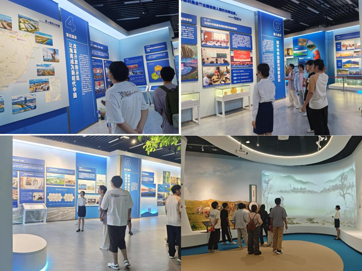 师生在智能导览指引下,参观“战略擘画”“制度创新”和“海洋强省”展区。同学们通过“智慧海洋”互动沙盘,实时查看环岛海洋观测网数据,直观体会智慧化与自贸港建设的紧密联系。展馆内,时光长廊串联起自贸港发展历程,“零关税、低税率、简税制”等制度创新成果,以及国际旅游消费中心等产业蓬勃发展的态势,令同学们深受震撼。大家还通过古画、模型及互动设备,领略海南历史文化、自然风光与生态保护成果。