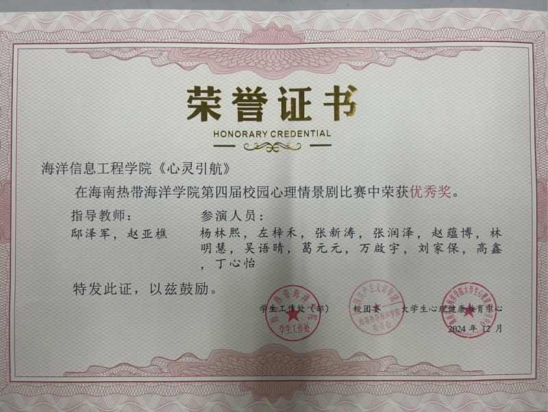 2024年12月18日,学校大学生心理健康教育中心在体育馆前举办永利集团第四届心理剧比赛,我院12位同学参演的《心灵引航》荣获决赛优秀奖。