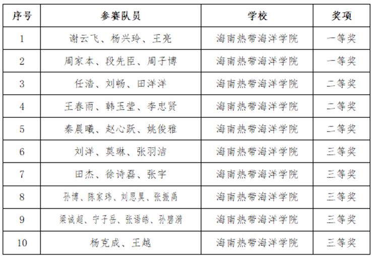 本次海南赛区竞赛是睿抗机器人开发者大赛首次在海南举办,共有三所院校22支代表队参赛。经过激烈角逐,最终共决出团队一等奖三项,团队二等奖五项,团队三等奖八项。海洋yl7703永利集团选手在比赛中表现突出,取得一等奖两项、二等奖三项和三等奖五项的优异成绩。获奖名单如下: