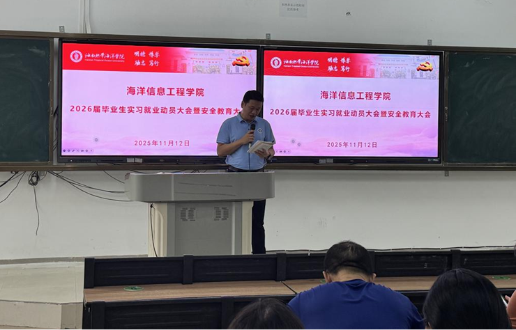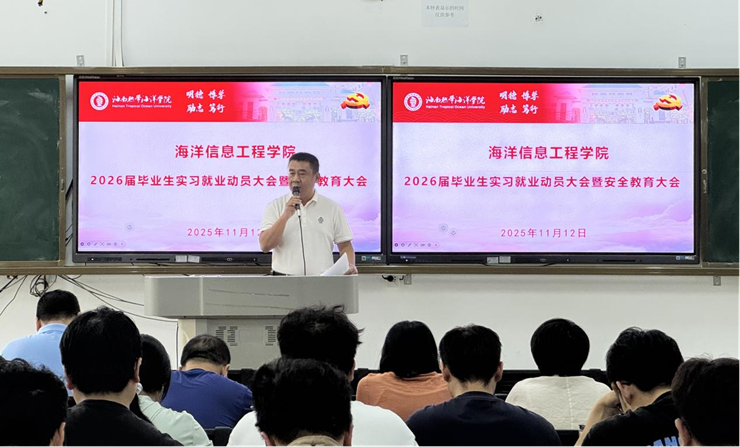 为切实做好2026届毕业生实习就业工作,强化学生安全意识,为毕业生实习就业之路保驾护航。11月12日下午,海洋yl7703永利集团在4204教室召开2026届毕业生实习就业动员大会暨安全教育大会。学院全体教师及2026届全体本硕毕业生参会。